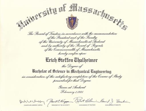 Bachelor of Science Degree in Mechanical Engineering, 1984